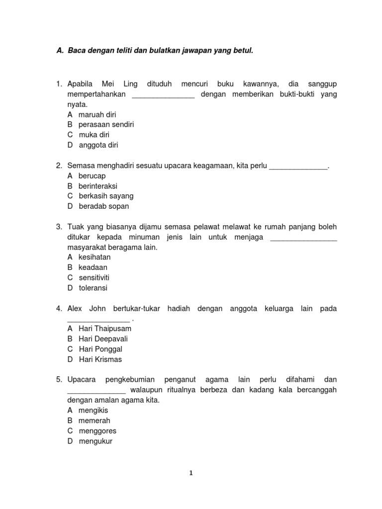 Contoh Soalan Ujian Bulanan 1 Pendidikan Moral Tahun 5